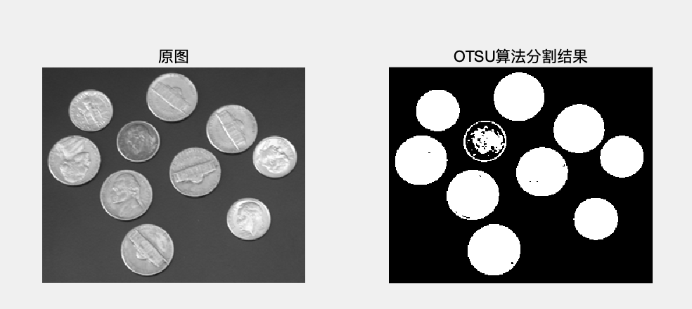 讯享网I=imread('coins.png'); level=graythresh(I); BW=im2bw(I,level); subplot(121); imshow(I);title('原图'); subplot(122); imshow(BW);title('OTSU算法分割结果');