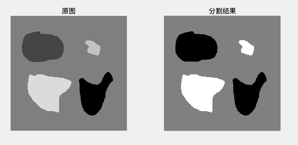 I=imread('toyobjects.png'); figure subplot(121); imshow(I);title('原图'); thresh=multithresh(I,2); %生成两个阈值 seg_I=imquantize(I,thresh); %使用两个阈值分割图像 subplot(122); imshow(seg_I,[]);title('分割结果');