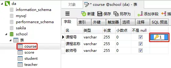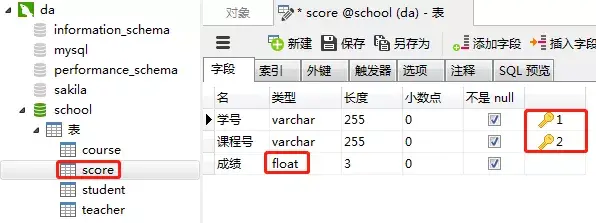 同样的步骤,创建“成绩表“。“课程表的“学号”和“课程号”一起设置为主键约束(联合主键),“成绩”这一列设置为数值类型(float,浮点数值)