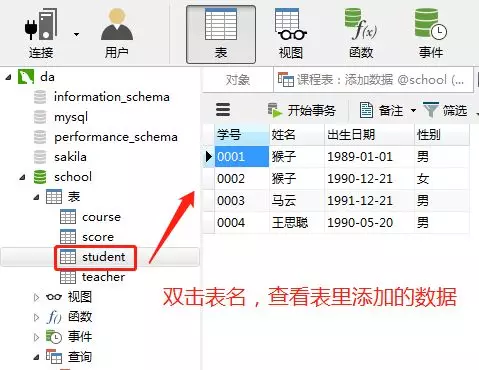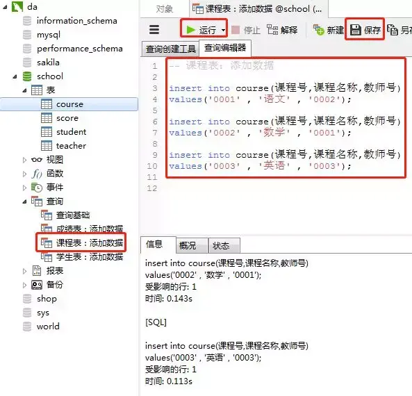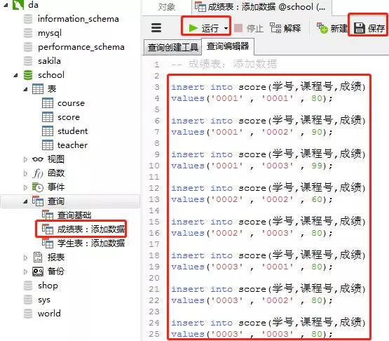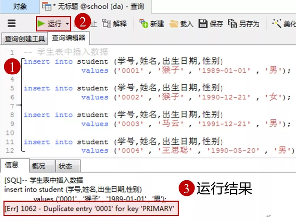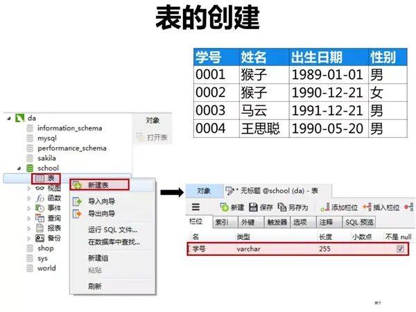 为了演示题目的运行过程,我们先按下面语句在客户端navicat中创建数据库和表。