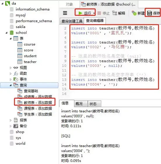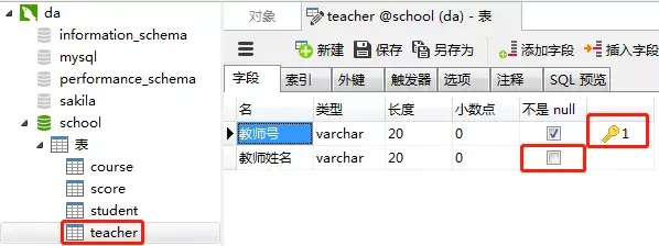 教师姓名这一列设置约束为“null”(红框的地方不勾选),表示这一列允许包含空值(null)