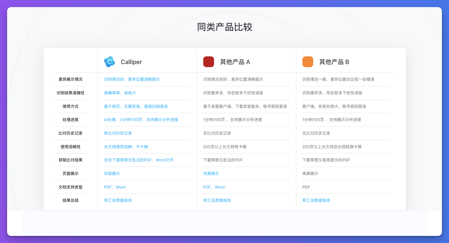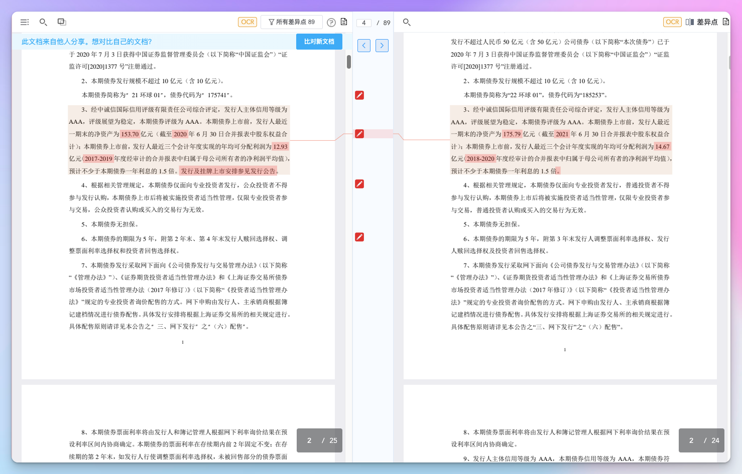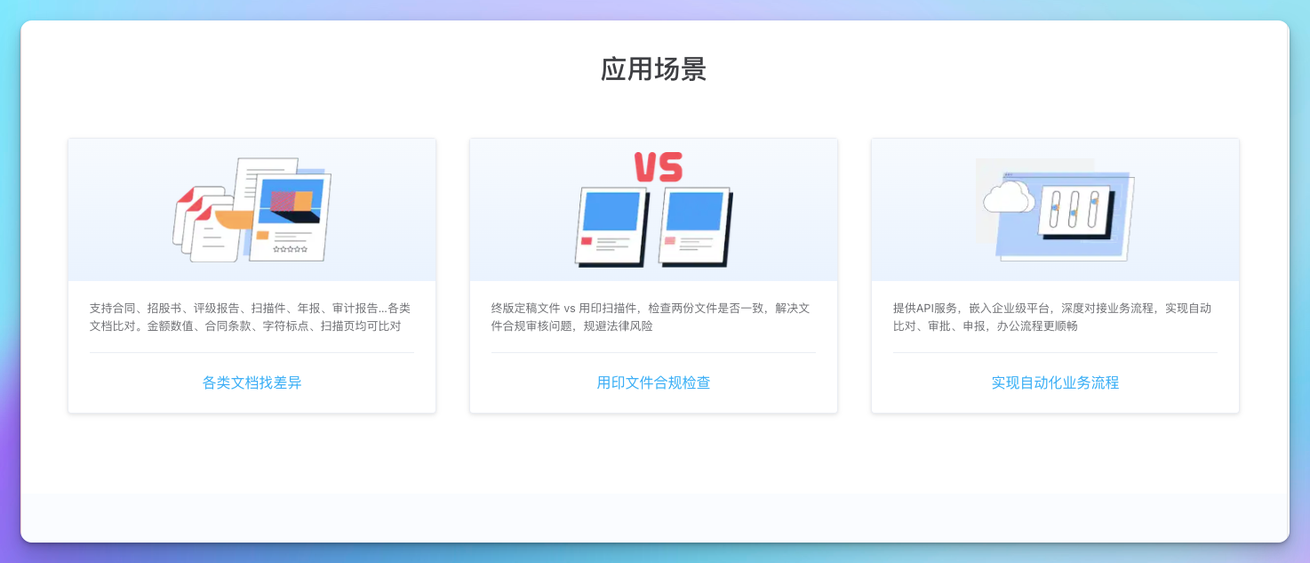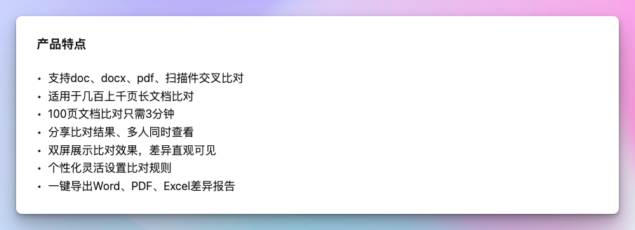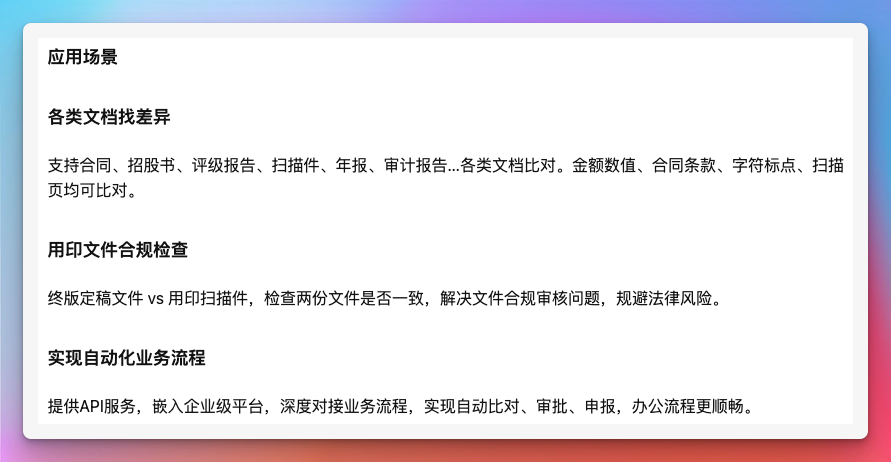支持合同、招股书、评级报告、扫描件、年报、审计报告…各类文档比对。金额数值、合同条款、字符标点、扫描页均可比对。