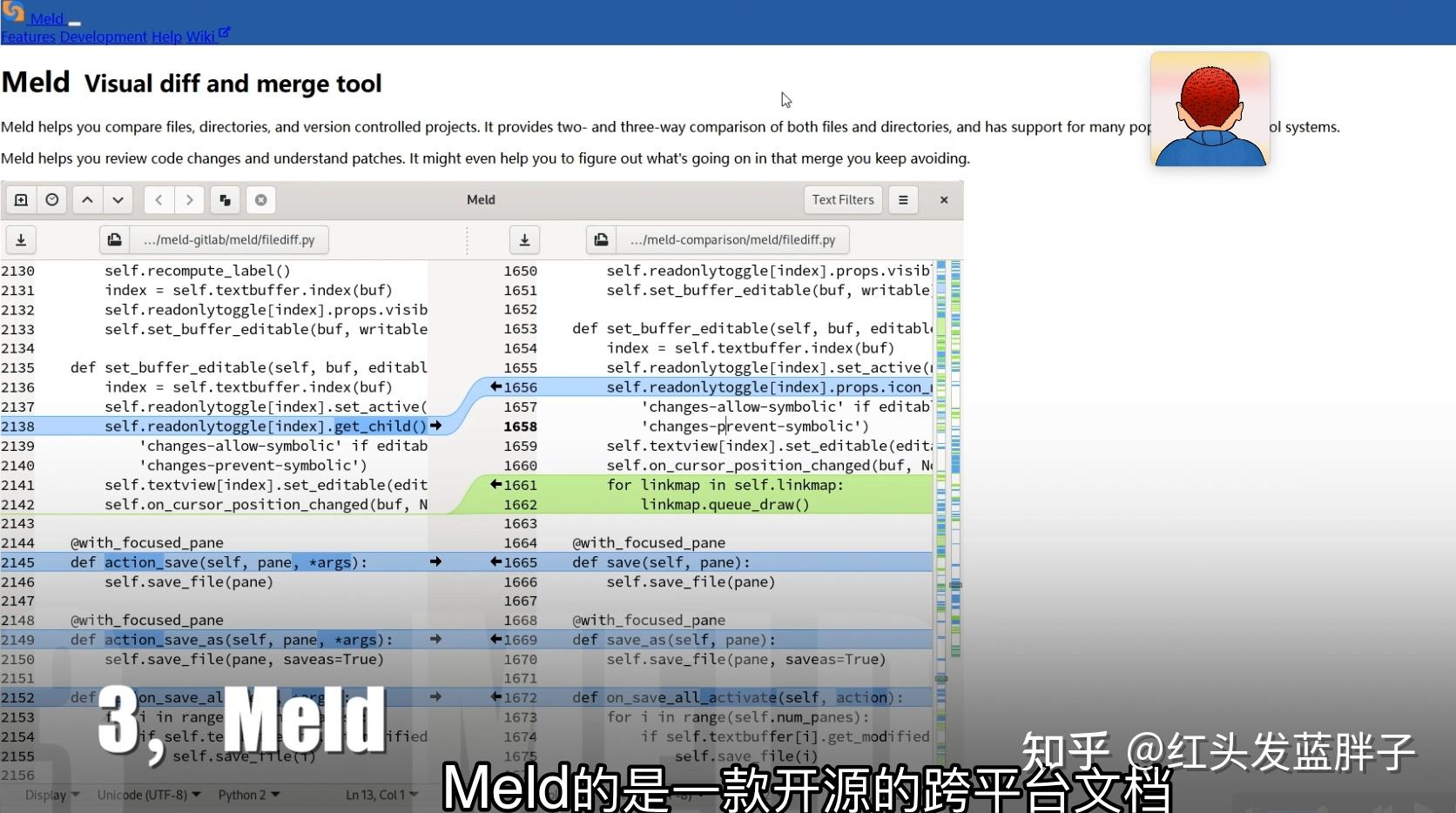 Meld 是一款开源的跨平台文档对比软件,适用于 Windows、Linux 和 macOS 等操作系统,支持比较文本文件、文件夹和图像文件