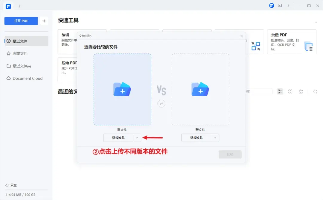 点击[选择文件],在左右两个框内分别上传不同版本的PDF文件。如果是Word、PPT或Excel文档,用鼠标选中文档,拖拽进万兴PDF软件中,系统会自动生成PDF。