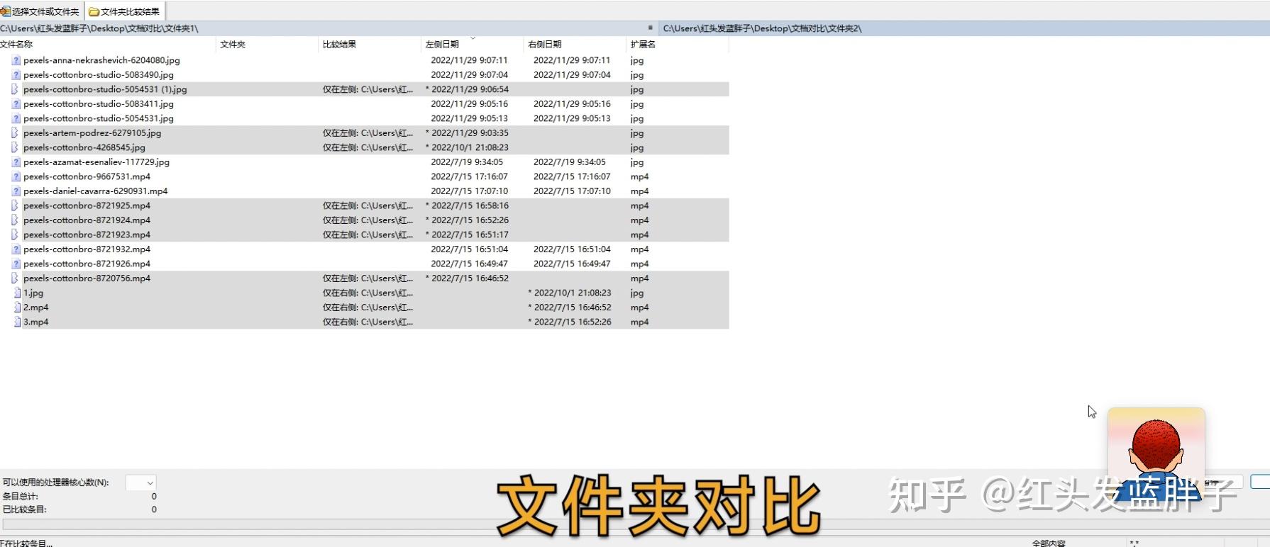 分别导入2个文件夹,点击比较。稍等一会,可以显示出文件夹的差异,比较结果中,说明了文件完全相同,还在仅在左侧或者右侧。