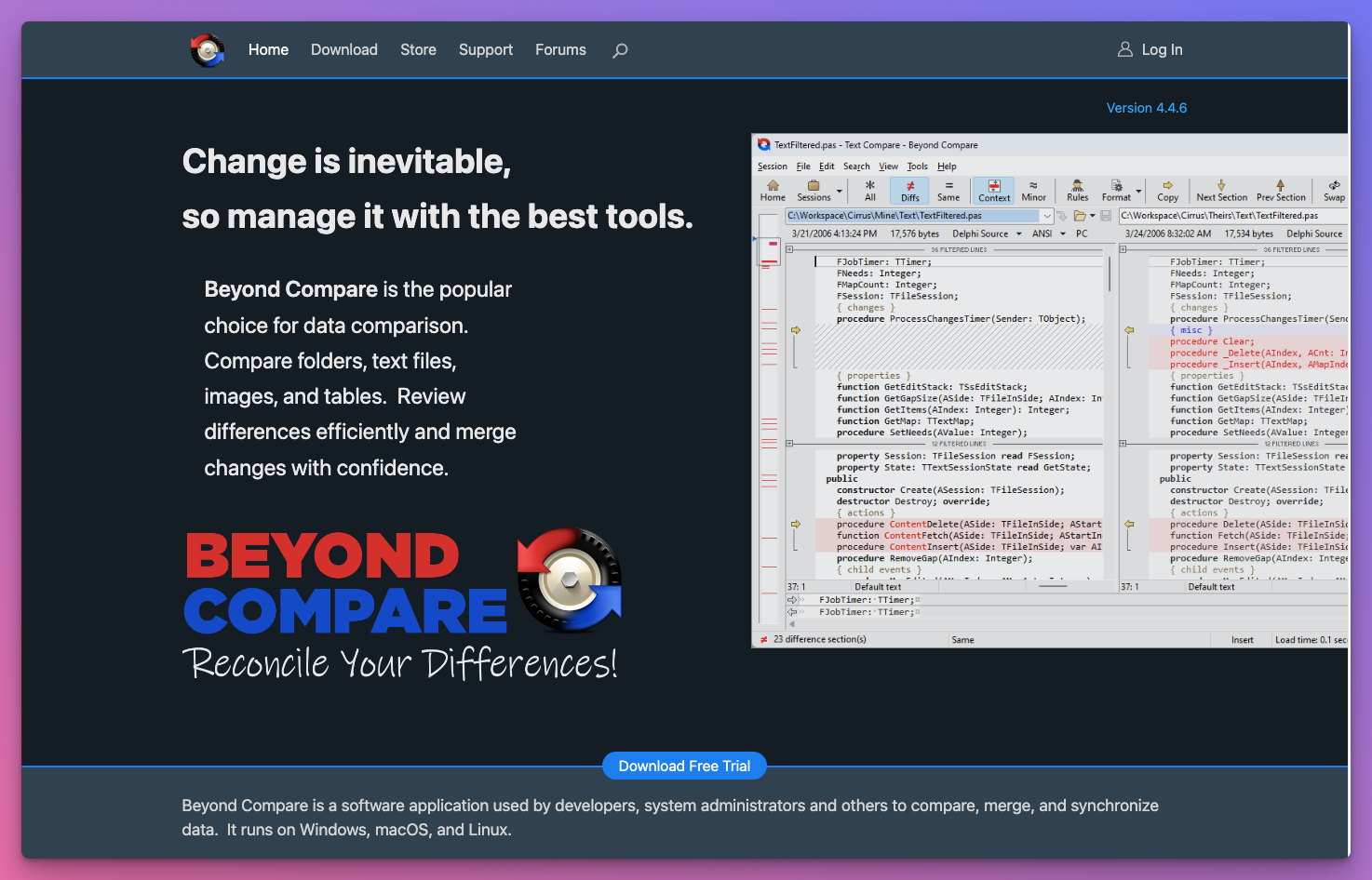 Beyond Compare 是一个优秀的文件比较工具,使用智能技术比较文件和文件夹。它使用简单但强大的命令,突出你要查找的差异,忽略你不感兴趣的差异。它帮助合并更改、同步文件甚至生成报告。