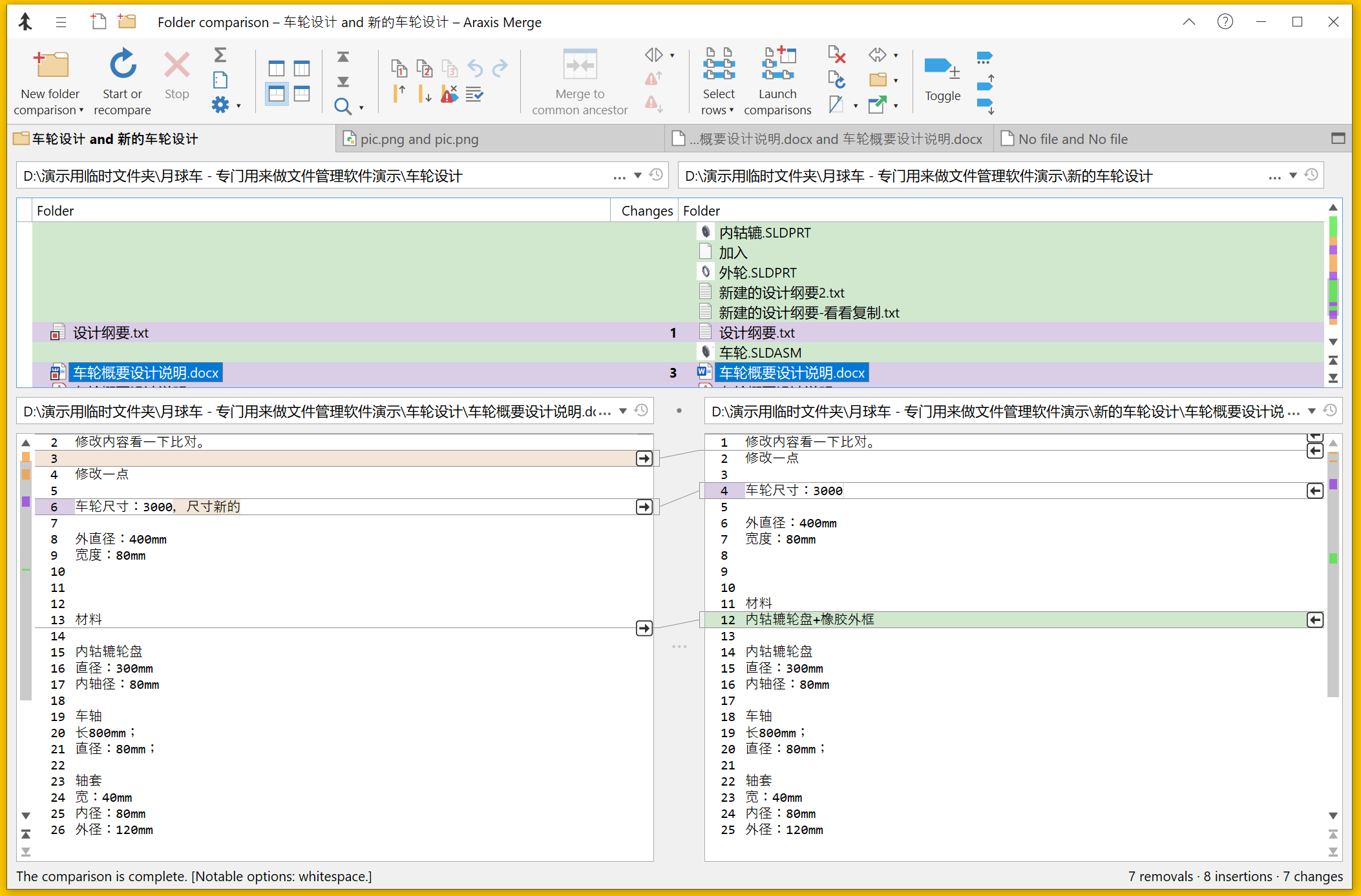 - 目前测的文件对比类型三款软件里界面最舒服,交互最流畅度。在文件夹结构对比界面里能直接看详细的文件对比内容,并且针对txt等格式可以直接在这个界面合并(可惜好像office类无法编辑保存);