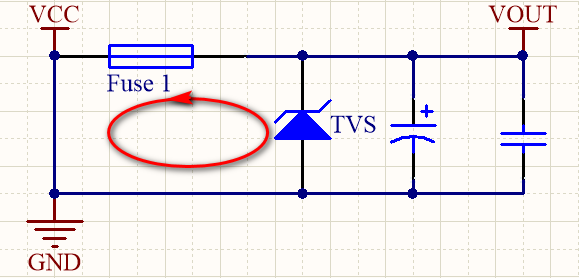 电源反接后,电路如红色箭头方向流动,TVS管正向导通,同时烧断保险丝,以至于不危及后级电路。正常工作转态下TVS管处于放电路浪涌抑制状态。