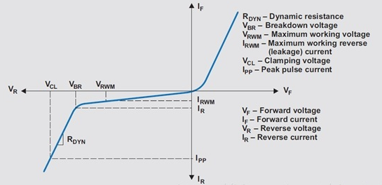 最大反向工作电压VRWM:指TVS管开始反向导通的工作电压,在TVS管的选型中,TVS管的VRWM要大于电路的正常工作电压,否则将导致TVS管反向导通,产生漏电流,影响电路正常工作。