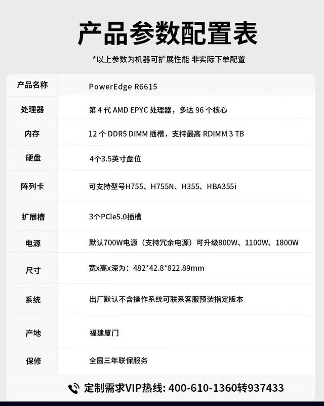 (中关村在线 四川行情)戴尔易安信PowerEdge R6615是一款高性能的1U机架式服务器,它采用了第4代AMD EPYC 9124处理器,提供了强大的处理能力和高密度的性能。戴尔R6615支持多达3个PCIe 5.0插槽和DDR5内存,能够满足传统和新兴工作负载的需求。其设计旨在提供高效的性能,同时减少碳排放量,并通过内置的安全性和智能自动化功能,简化IT环境的管理。