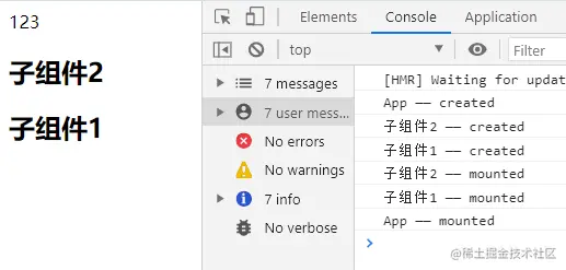 我首先创建了两个子组件:CompOne 和 CompTwo,分别在两个组件中写入了mounted方法和created方法。