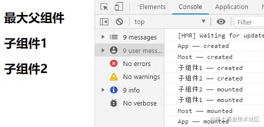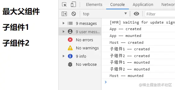 不论子组件嵌套多少层,总是最外层(最大的父组件:App.vue)的生命周期created先执行,mounted最后执行,接下来便是向内一层(CompOne.vue)的生命周期created执行,接下来就是再向内一层(也就是第三层)的生命周期created执行,其次第三层的mounted执行,然后就是第二层的mounted了。
