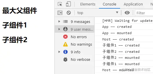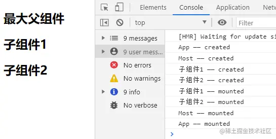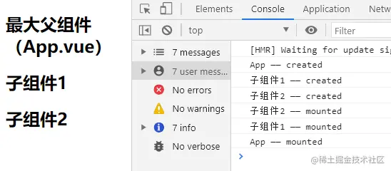 接下来呢,我们把他引到父组件(App.vue)中来看看,当然,在父组件(App.vue)中也有created和mounted方法