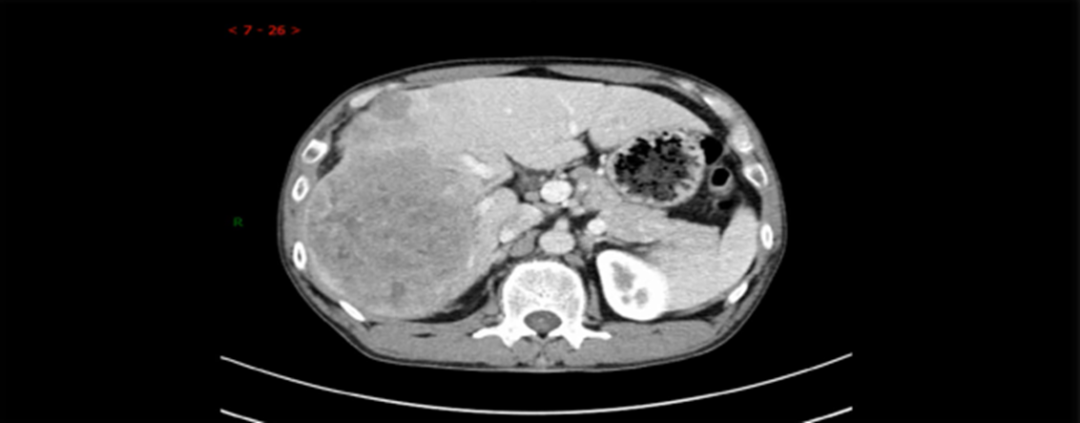➣ 2019年4月23日,腹部增强CT:右肝巨块型肿块,大小约16*15*10cm,伴周围子灶形成;右肝静脉、门静脉右后支受侵;肿块体积 1236.63㎝³,左肝体积 863.97㎝³。