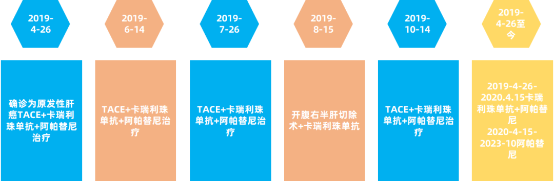 2019-4-26,TACE(雷替曲塞、多柔比星脂质体化疗+碘油、PVA/微球超选栓塞),每月1次,2019-6-14进行第二次介入,2019-7-26进行第三次介入,2019-10-14进行术后第一次介入,2020-4-15术后第二次介入。