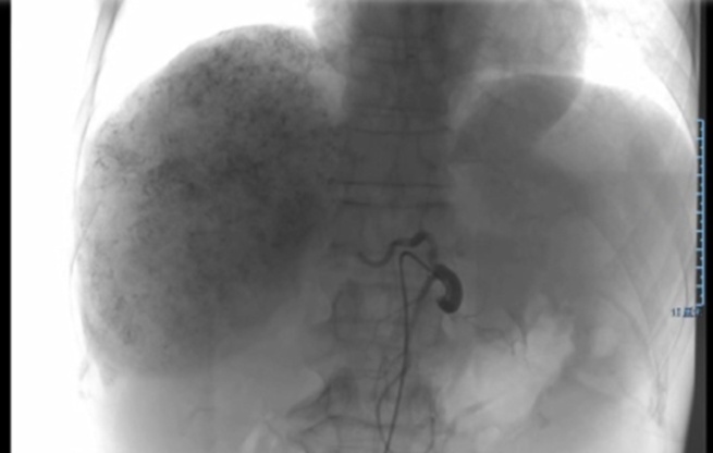 ➣ 病灶及受累血管局限在右半肝;Child-Pugh A级;剩余肝体积 / 标准肝体积 > 40%;ICG 15分钟滞留率=25%。因此,不可手术切除。