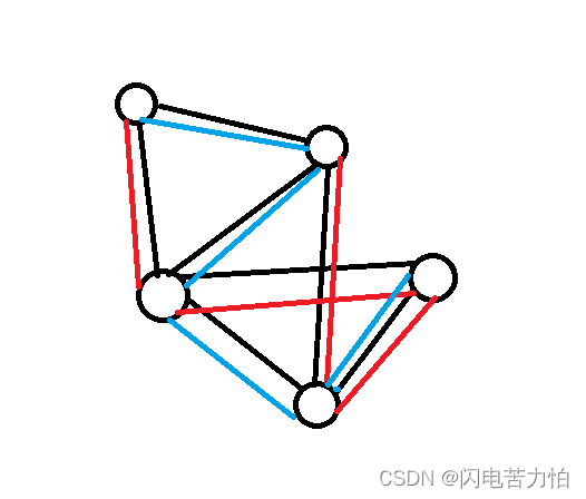 其中黑色的边是原图,红色的边是它的一个生成树,蓝色的则是它的另一种生成树
