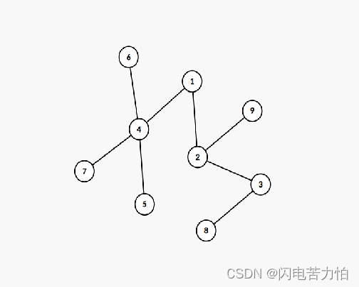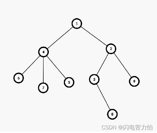 其中1是整棵树的根。这棵树的层次关系就一目了然了,打个比方其中6是4的子节点,4是6的父节点,4的度为3,2的度为2;6,7,5,8,9是整棵树的叶节点,而3的深度为1,8的深度为3。