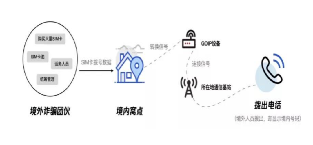诈骗集团利用高薪诱惑境内人员将同时安装了上百张电话卡的“GOIP”设备放在国内指定地区。诈骗分子就可以通过这些设备批量拨打诈骗电话、发送短信进而实施诈骗。