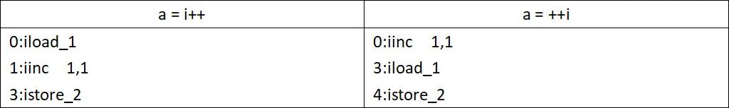 第 1 处说明:局部变量表就像一个快递柜,有着很多的柜子,依次编号为1,2,3,…,n,字节码指令 istore_1 就代表打开了 1 号柜子,再把栈顶中的值 10 存进去。栈就好如一个桶,任何时候只能对桶口的元素进行操作,所以数据只能在栈顶进行存取。部分指令可以直接在柜子里面直接进行,比如 iinc指令,直接对抽屉里的数值进行 +1操作。我们经常遇到的 i++ 和 ++i,通过字节码对比起来,答案一下子就一目了然了。如下表格所示: