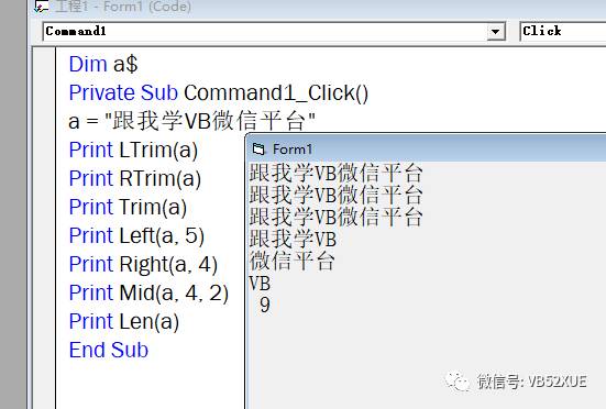 eg: Trim( VB)= 跟我学VB微信平台 (去掉左右两面的空格)