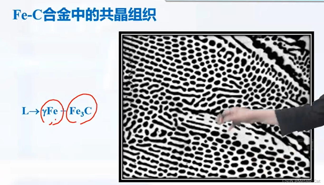 对于二元共晶反应:如果生成的两个生成物之间的体积分数相当,那就会产生片层相间的共晶组织。如果体积分数差别较大,则体积分数大的那个作为基体,体积分数小的则是在基体上点缀的小点