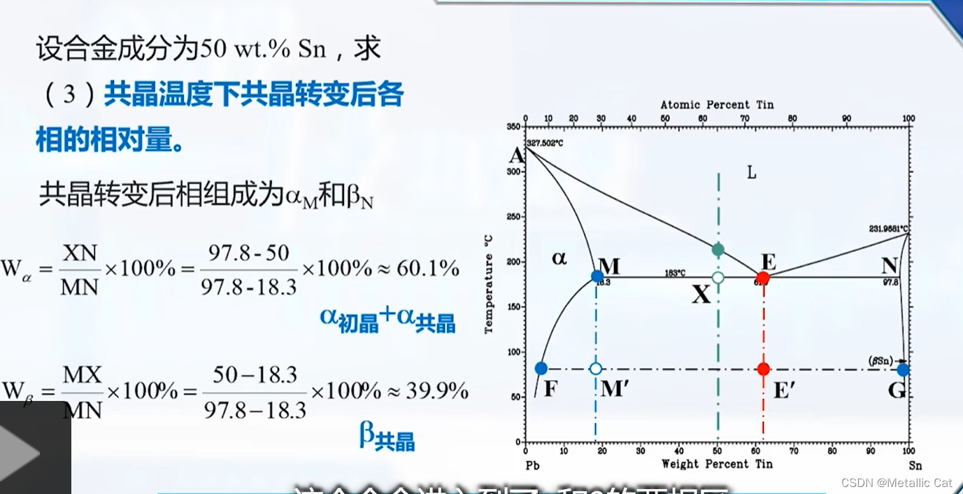 2.在进行共晶反应的时候,固相的成分为固相反应线与左右两端的固相线的交点(αM和βN这两个固相点)所对应的成分