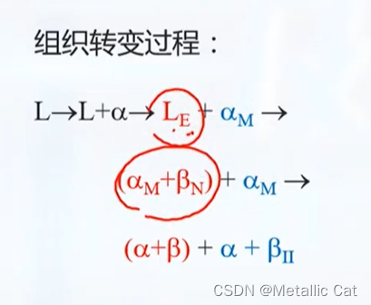 然后是共晶转变 --- 生成的初晶α相转变为共晶状态下的αM组成,然后液相继续析出共晶状态下的固体,知道液相全都消耗完后结束共晶反应