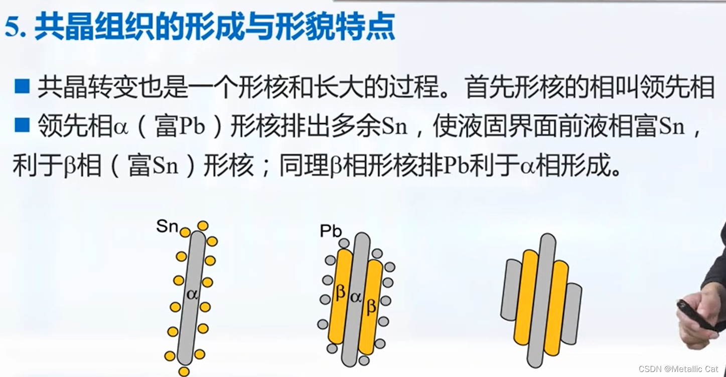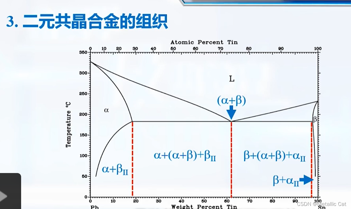 第一步是匀晶转变(有自己的α相 --- 初晶生成),第二步是共晶转变(生成只有在共晶温度下才会出现的α相和β相 --- 依附于之前生成的α相的相界以共晶体的方式形核), 第三步是脱溶分解(第一步生成的α相中排多余的Sn --- 用相(富含Sn的β相)的方式排出 --- 次生相)