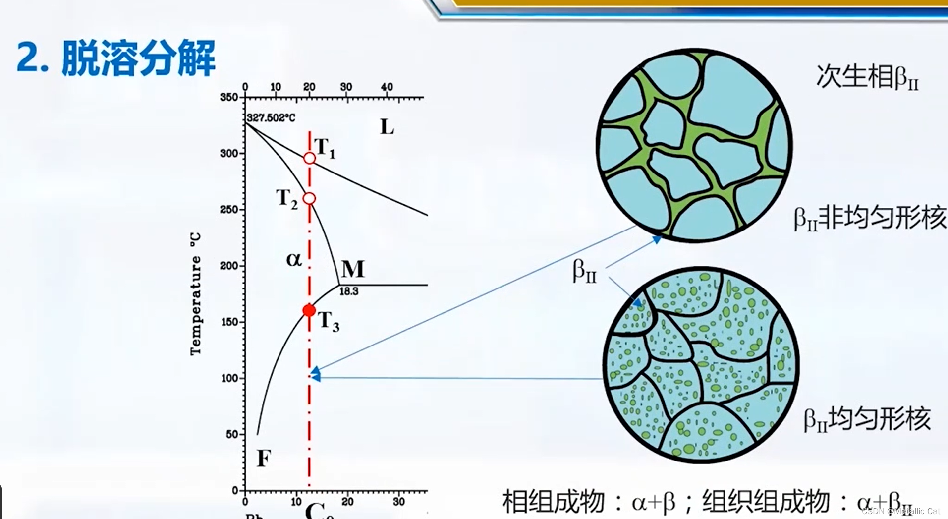 此时如果继续降温就会发生脱溶分解以及共晶体中的组成的成分改变 --- 首先在共晶温度下所有组成的成分都是共晶温度下的成分,脱离共晶温度之后就变回了正常温度下的成分(去掉了下标), 此时初晶转变为的αM相又变回初晶α相,同时发生脱溶分解 --- 出现次生相β相