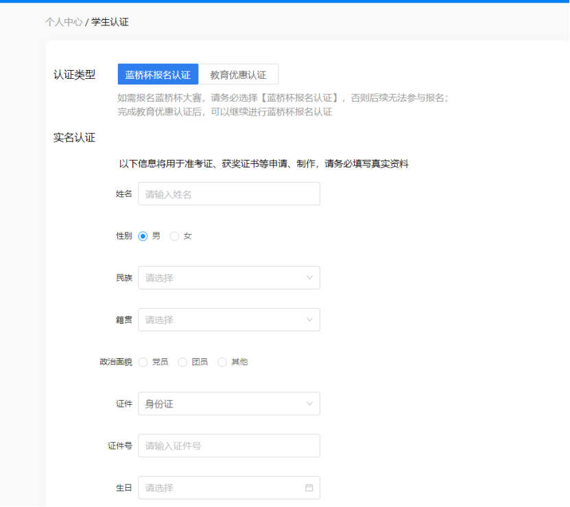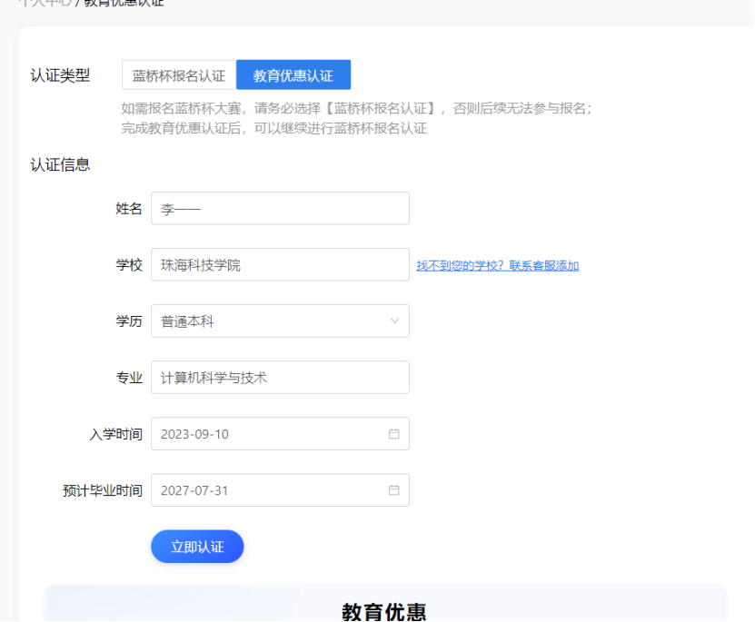 有需要蓝桥教育优惠的同学可以点击<教育优惠认证>按钮,填写完整信息后获取教育优惠。