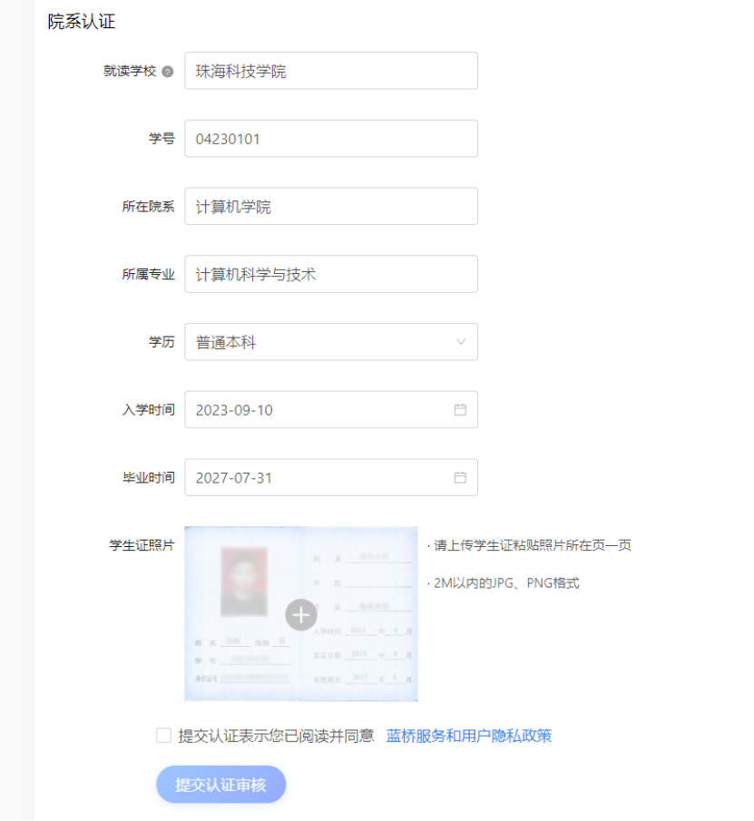 4.在学生认证界面输入实名认证信息和院系认证信息后点击<提交认证审核>。