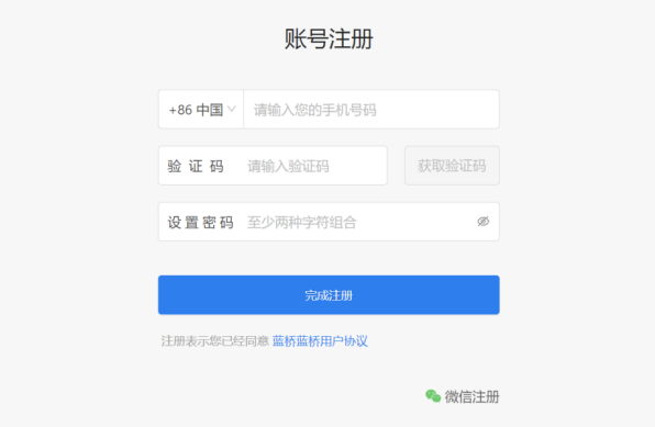 2.在账号注册界面输入手机号等信息,也可以直接点击右下角微信注册。
