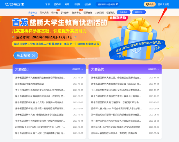 1.在蓝桥杯官网(https://dasai.lanqiao.cn/)右上角点击注册按钮。