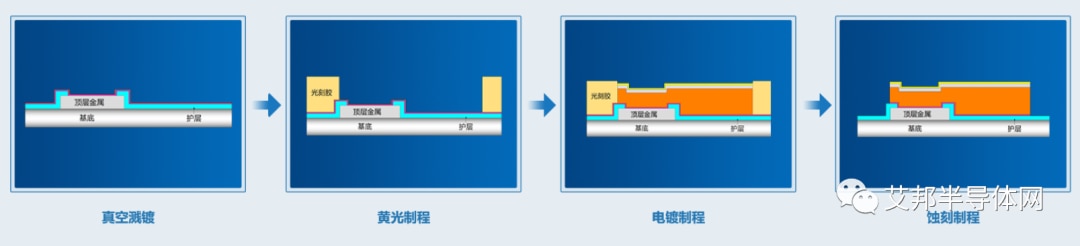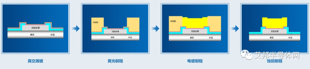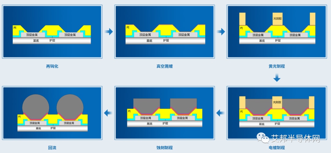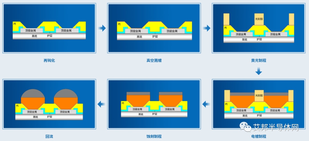 铜柱凸块制造主要步骤包括再钝化、真空溅镀、黄光、电镀、蚀刻等,具体工艺流程图如下: