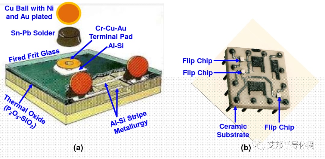 (a) IBM 的首个具有 3 个端子晶体管的倒装芯片组件;(b) IBM 首个在陶瓷基板上的倒装芯片组件(3 个芯片)