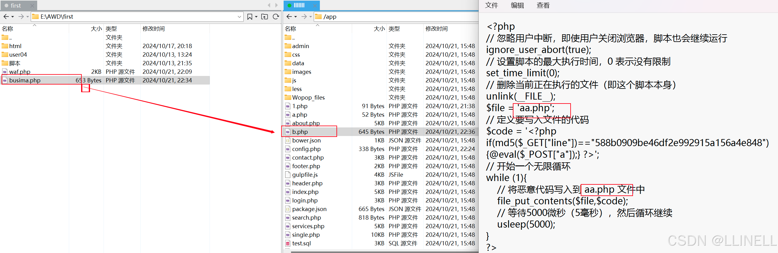 首先访问b.php文件让他生成不死马(aa.php),生成aa.php文件后原来的xd.php文件就会自动被删除掉 // unlink(FILE);