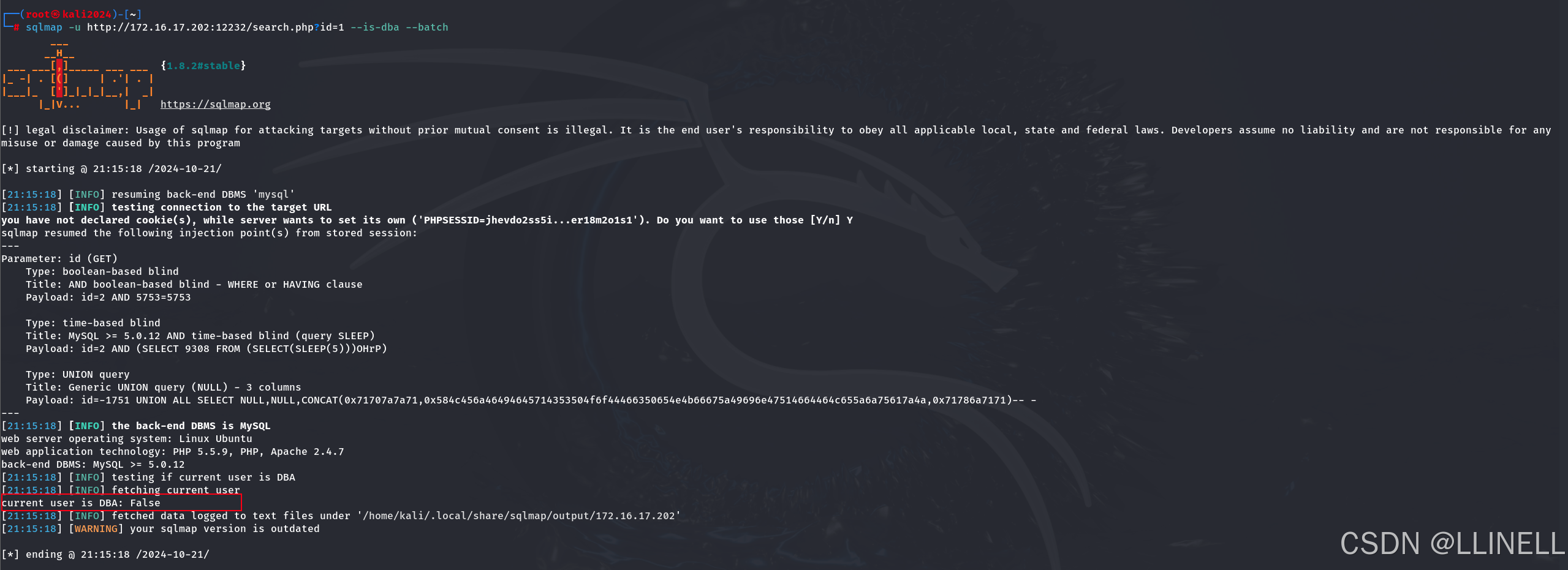 直接使用sqlmap对 search.php 页面上的id参数进行SQL注入测试