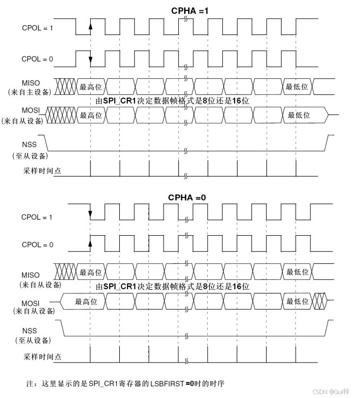 3. SCK的空闲状态必须和SPI_CR1寄存器指定的极性一致(CPOL为’1’时,空闲时应上拉SCK为高电平; CPOL为’0’时,空闲时应下拉SCK为低电平)。