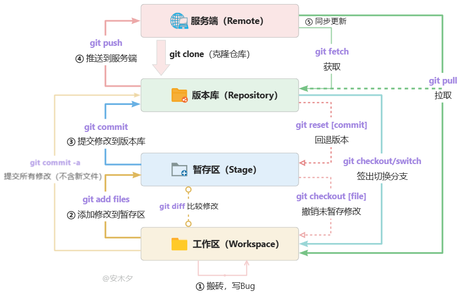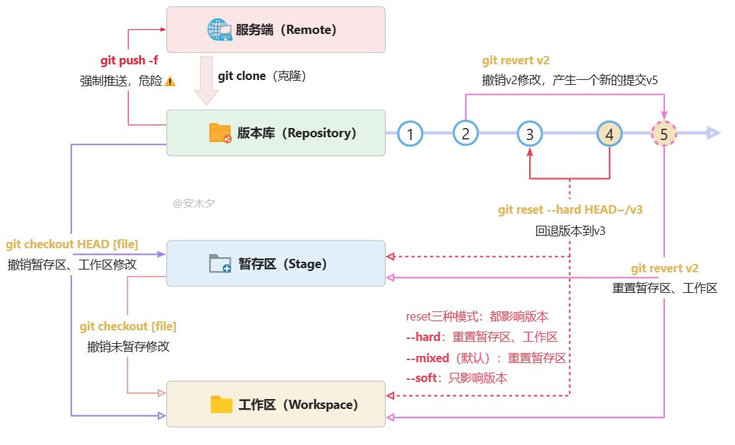 reset是专门用来撤销修改、回退版本的指令,支持的场景比较多,多种撤销姿势,所以参数组合也比较多。简单理解就是移动master分支、HEAD的“指针”地址,理解这一点就基本掌握reset了。