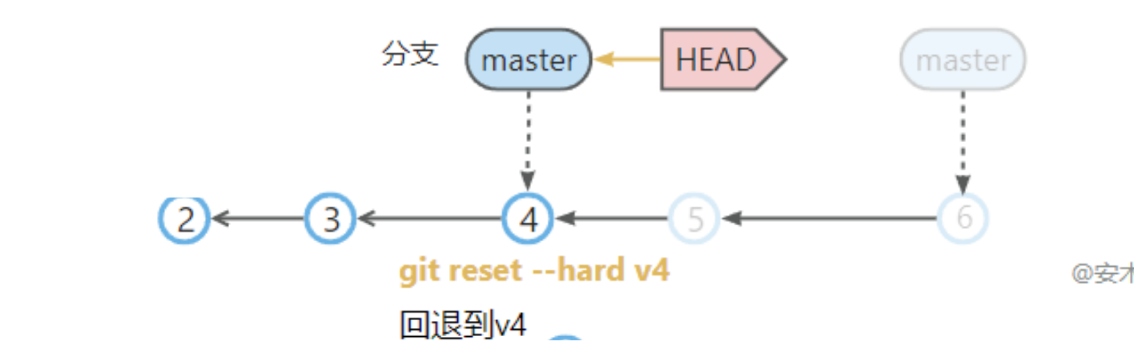 回退到版本v4 master、HEAD指针移动到v4。v5、v6就被废弃了。