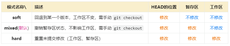 reset有三种模式,对应三种参数:mixed(默认模式)、soft、hard。三种参数的主要区别就是对工作区、暂存区的操作不同。