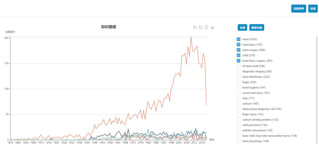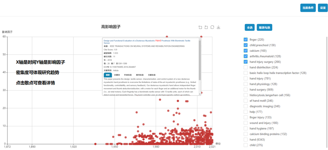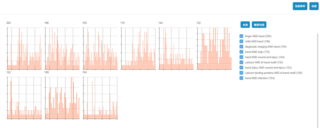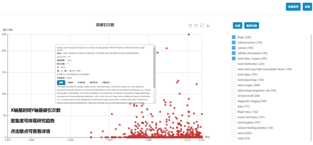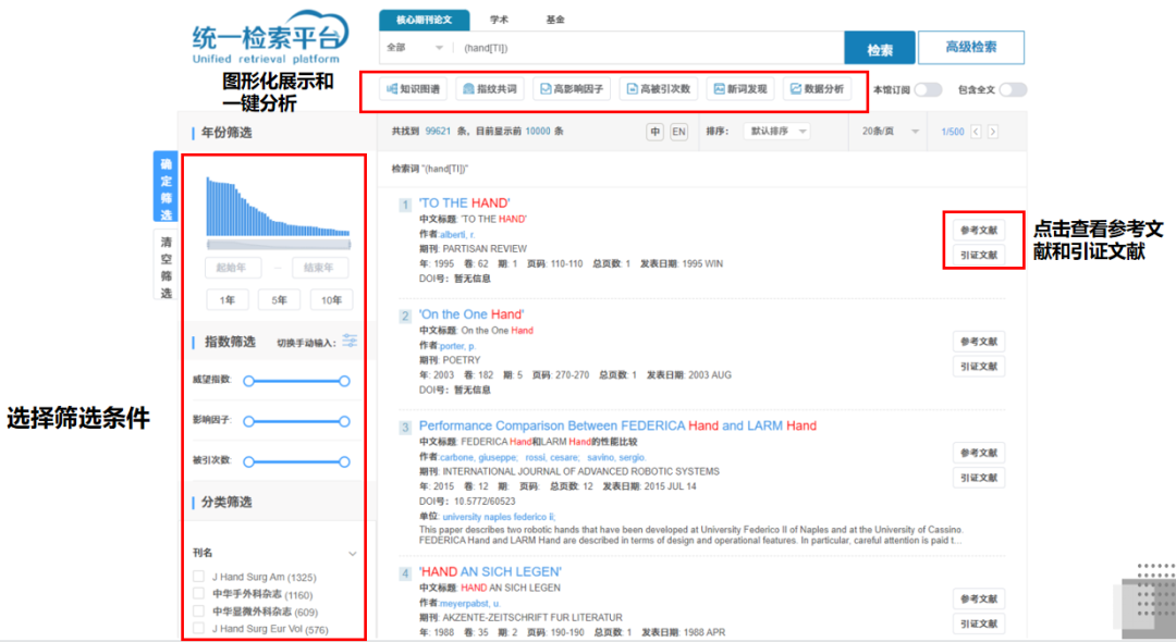 - 图形化展示:根据检索结果记录的特有属性,包括文献时间,论文被引等图形化展示,用户可以快速定位经典文献或最新论文,便于用户区分和使用。