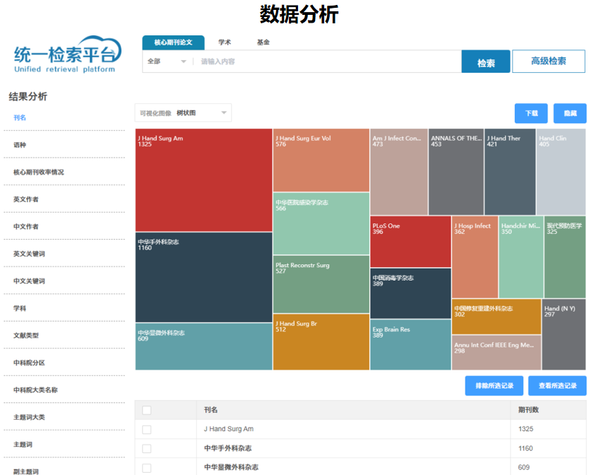 统一检索平台只收录《中国科学院文献情报中心期刊分区表》、《中国科学引文数据库》、北大《中文核心期刊要目总览》、《中国科技论文统计源期刊》、《PubMed》收录的期刊,涵盖了国家认可的各类核心期刊,本系统目前整合的数据库,除了国内的知网、万方、维普等,还包括国外的数据库、出版社、学会刊物等一百余种,用户可实现一站式检索。