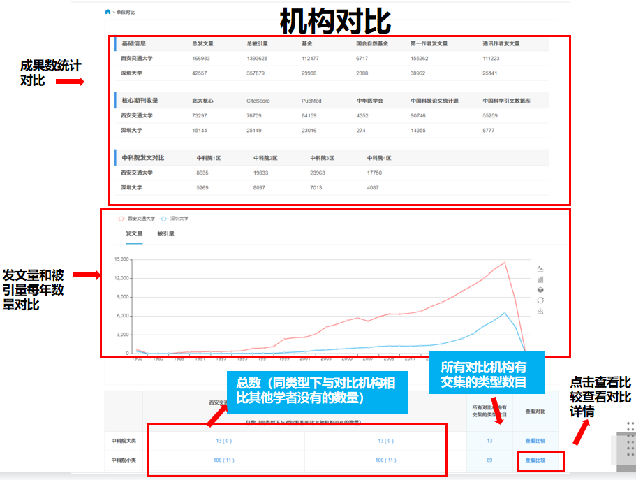 - 机构库:将大多数的核心论文按照发文单位加以归纳及区分,并未各个单位建立机构名片,可以实现多个单位间发文,被引,学科,基金等的数据对比,为单位管理层的学科建设和科学研究等提供粗略的决策依据。