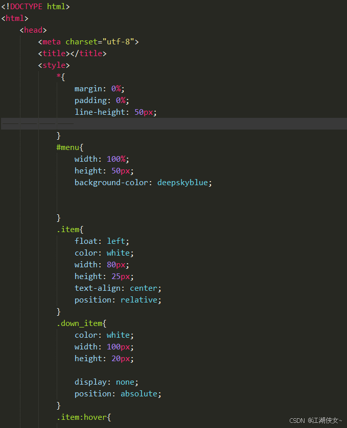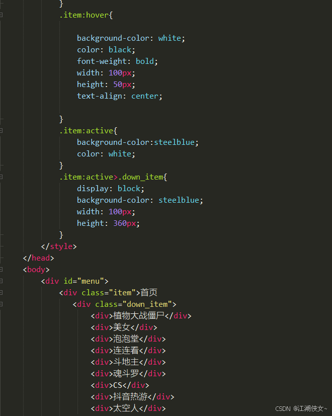 <p>做题思路:首先在body那里创建一个div(class=menu),在heal里面进行css操作,1、先写一个类选择器标签.menu添加宽度长度以及背景颜色,在设置一个通配符选择器将他的padding和marig设置为0。2、在div(class=menu)下面创建一个div(class=item),用类选择器.item进行float的左对齐,设置文字颜色,宽度。用相对定位3、在div(class=item)下面创建一个div(class=down.menu),用display:done及进行隐藏,并绝对定位可以设置其背景颜色。4、若将鼠标放到item上会变色则用hover进行,若点击可显示菜单栏则用active并用display:back解除。具体代码如下:</p>