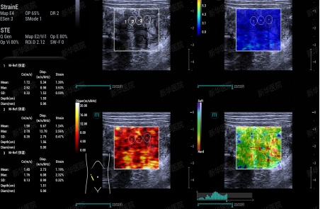 2、超声剪切波弹性成像技术:通过实时、定量、可视化地显示肠壁的软硬度,反映肠壁的僵硬程度或纤维化程度,辅助评估IBD药物治疗的疗效,如肠壁硬度增加,则提示其对药物治疗反应不敏感,通常需要手术进一步治疗;还可以辅助判断肠腔狭窄类型,炎症性狭窄还是纤维性狭窄,对后续治疗方式的选择尤为重要。