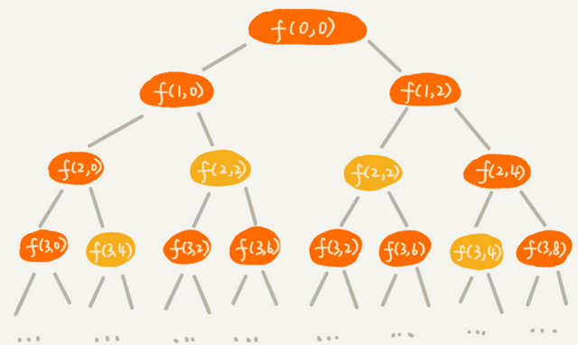 递归树的每个节点表示一种状态,用(i, cw)表示。如:(2, 2) 表示我们将要决策第2个物品是否装入背包,在决策前,背包中物品重量是 2。另外,在递归树中,有些子问题的求解是重复的,如f(2, 2) 和 f(3, 4) 都被重复计算两次。这里我们可以使用备忘录,记录已经计算好的f(i, cw),当再次计算f(i, cw),可以直接从备忘录中取出来,这样可以避免冗余计算。