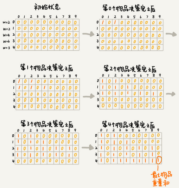 第0个(下标从0开始编号)物品重量是2,要么装入,要么不装入背包,决策完后会有两种状态,背包中物品重量是0或2.即states[0][0] = true 和 states[0][2] = true。