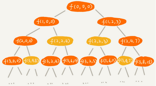 画出递归树,每个节点表示一个状态,用3个变量(i, cw, cv)表示一个状态,从下图可以看出,有几个节点的 i 和 cw是完全相同的,比如分f(2, 2, 4) 和 f(2, 2, 3),在背包总重量一样的情况,选择更大的总价值,即状态f(2, 2, 4)。即对于(i, cw)相同的不同状态,保留cv值更大的那个状态,继续递归处理,不考虑其他状态。